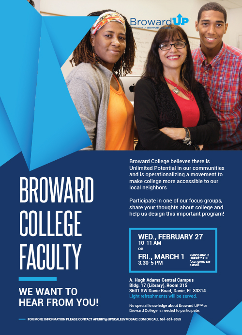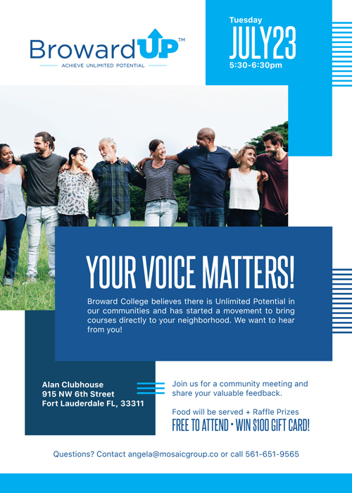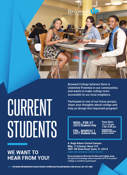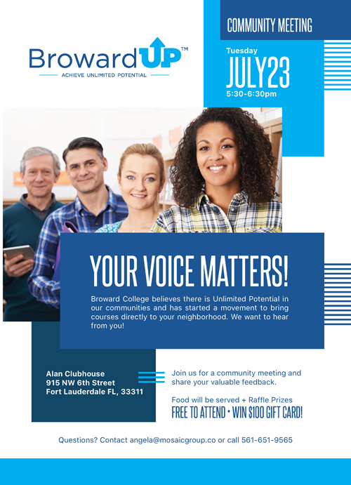 Lead the outreach, education, and recruitment efforts for Broward College’s new movement “Broward Up – Unlimited Possibilities”. Broward Up focuses on six zip codes in Broward County with high concentrations of minority populations. We are conducted market research including focus groups, surveys, and stakeholder interviews with potential students, current students, workforce partners, and local businesses. The data will allow Broward College to create outreach, educational (what is Broward Up and what Broward College has to offer), and recruitment strategies that will be effective in engaging the target audiences. To reach potential students, we collaborated with community partners such as the Urban League, YMCA, OIC, Boys & Girls Club, and Housing Authorities. In addition, we used a grassroots approach including outreach to churches, civic groups, door-to-door canvassing, call campaigns, geo/demo targeted social media ad campaigns, and more.